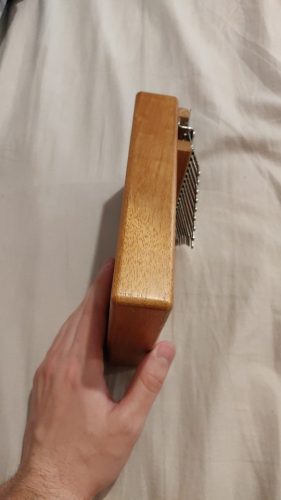 Hold the Kalimba Thumb Piano in your hands, with your thumbs resting on the back and your fingers supporting the instrument.
